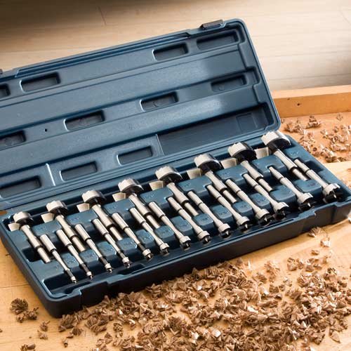 Perfect for doweling, mortising, pocket holes, hardware installation and more! Set includes 1/4", 5/16", 3/8", 7/16", 1/2", 9/16", 5/8", 11/16", 3/4", 13/16", 7/8", 15/16", 1", 1-1/8", 1-1/4", 1-3/8", 1-1/2", 1-5/8", 1-3/4", 1-7/8", 2" and 2-1/8" bits. With 3/8" round shanks. Multi-spurs on bits 1" and larger increase cutting ability and reduce heat build up. Two sharpened inside edges easily cut through all woods and make flat bottomed holes. Polished ground rim and spurs produce smooth hole walls and accurate diameters. Wide flute openings allow fast chip removal. Made of high carbon steel. Comes in attractive wood case.